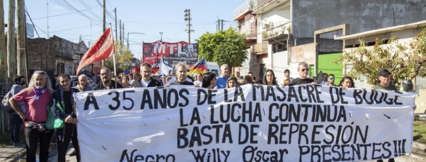 Integrantes de organizaciones de Derechos Humanos -entre ellos la sec. de DDHH de la FeTIA- funcionarios, vecinos, familiares y amigos realizaron este domingo 8 de mayo una marcha y un acto en memoria de las víctimas a 35 años de la «Masacre de Ingeniero Budge», el primer caso de «gatillo fácil» desde el regreso de la democracia en 1983 en el que policías bonaerenses acribillaron a balazos a tres jóvenes.