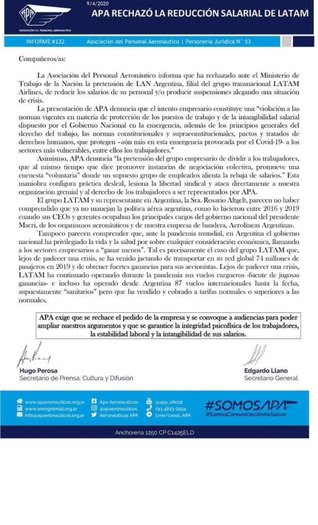 APA RECHAZÓ LA REDUCCIÓN SALARIAL DE LATAM